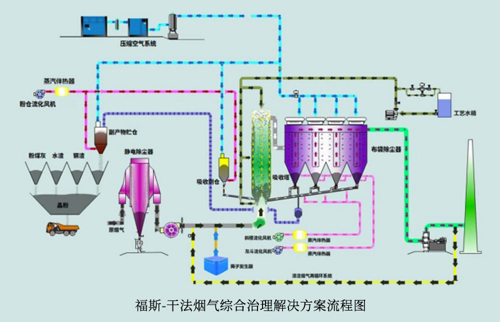 福斯干法(FOSS-D)技術(shù)是以福斯離子發(fā)生器、堿性高分子材料、技術(shù)升級的強(qiáng)效脫除反應(yīng)塔為核心的一體化協(xié)同治理技術(shù)。該技術(shù)完美融合了單一脫硫、單一脫硝、CFB半干法、活性焦干法等工藝優(yōu)勢。可實現(xiàn)一塔脫除多種污染物(脫硫、脫硝、脫二噁英、脫氟),具有較好的經(jīng)濟(jì)性與可持續(xù)性。