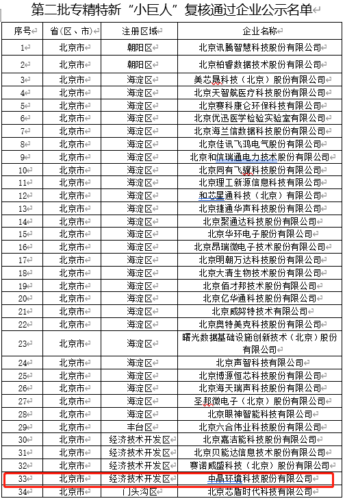 2023年7月14日,北京經信局公布了《第五批專精特新“小巨人”企業和第二批專精特新“小巨人”復核通過企業名單》,中晶環境科技股份有限公司作為國家第二批專精特新“小巨人”榮幸通過此次復評,有效期3年。此次評審及復審工作,是為貫徹落實習近平總書記關于“培育一批‘專精特新’中小企業”、提升中小企業創新能力的重要指示精神,按照黨的二十大報告決策部署,根據《優質中小企業梯度培育管理暫行辦法》,由省級主管部門組織,工業和信息化部組織專家按照《辦法》進行審核并實地抽檢后評選通過的。